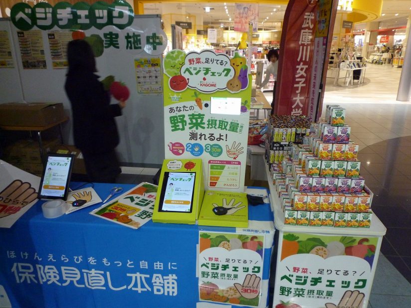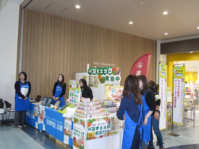 保険見直し本舗様とコラボレーションし、野菜摂取量を測定する「ベジチェック」を実施しました。店舗スタッフの皆様にも一緒にブースに立っていただいて行った本イベントは、ご自身の健康状態を知り、保険について考えたり、見直したりするきっかけとなったようです。お子さまや家族連れで楽しめる出展内容が多い中、幅広い世代の方に楽しんでいただけました。