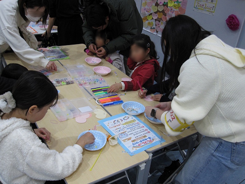 ビーズでオリジナルブレスレット・キーホルダーを作るワークショップを実施しました。2日目のみの出店ながら、オープン早々、人が集まり大賑わいでした。ブースの展示など一つひとつの制作物は、色画用紙や動物のキャラクターを用いて手作りされており、子どもの興味を惹きつける教育学部生の学びを活かした装飾が見られました。