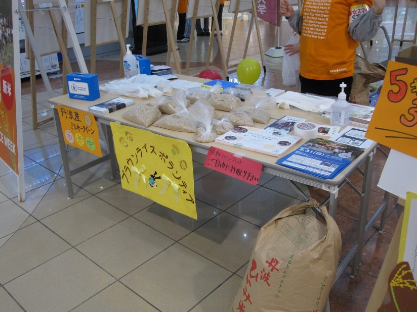 ブラウンライスボランティアはブラウンライスウィークの活動に取り組むボランティア団体です。今回は、田植えから稲刈りまでした玄米の販売、レッドカップの販売、国連WFP「学校給食プログラム」の募金活動と、展示にて活動の紹介と寄付先の国連WFPの広報を行いました。バルーンアートを活用しながら、積極的に声掛けを行い、多くの方に活動について伝えることができました。