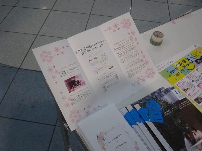 自分好みの香りでアロマサシェを作成できるワークショップを開催しました。このサシェの香り付けに使用するミストをone’sterrace様よりご提供いただきました。誰でも簡単にできる体験は小さなお子さまにも大人気でした。また、広報スタッフの視点を活かし、使用したミストの商品紹介パンフレットを作成。広報活動のプロセスを実践しました。