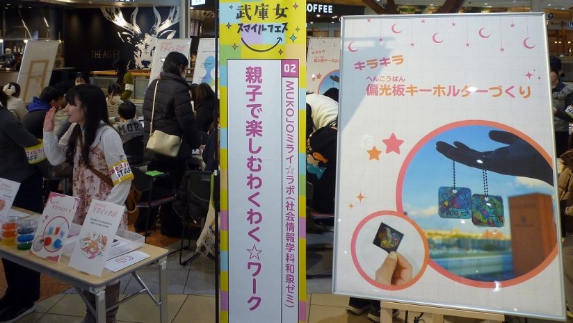 MUKOJOミライ☆ラボはリケジョを応援する取り組みを行っており、活動の一つとして、小学生以下を対象にサイエンスへの関心を高めるワークショップを開催しました。今回は「偏光板キーホルダー作り」と「スライム作り」を実施。小さいお子さまの参加も多かったですが、体験前に紙芝居でその仕組みを説明することで、参加者たちは楽しく科学を学べました。