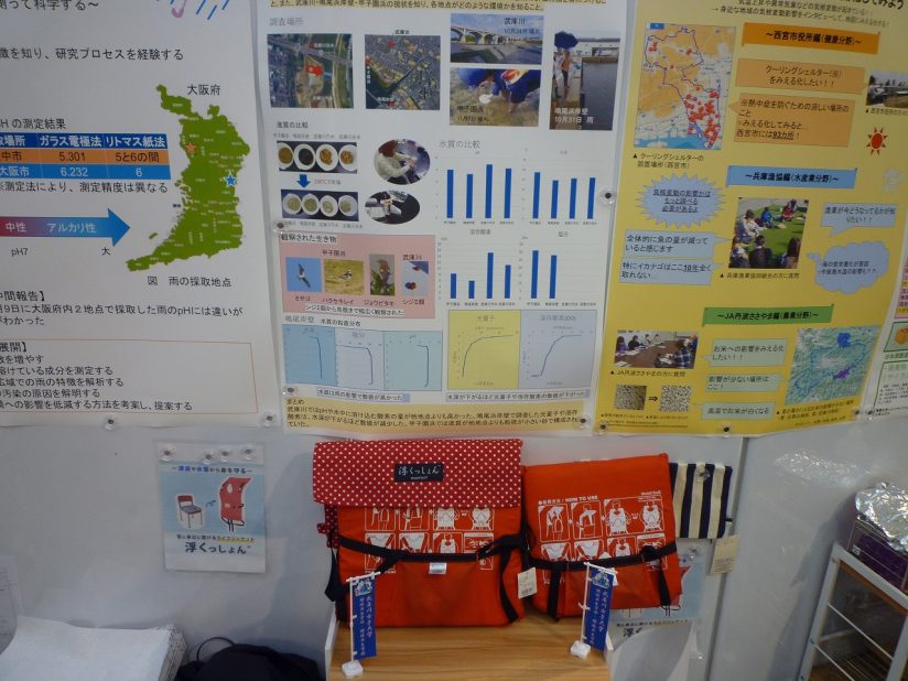 環境共生学部の学びが体験できるブースを展開しました。顕微鏡で微生物を観察したり、植物について学べるクイズをしたり、色の変化が起こる実験をしたり。また、展示では、授業でお世話になっているモンベル様との活動について紹介。モンベル様には、災害時にライフジャケットとなるクッション「浮くっしょん」をご提供いただき、一緒に展示しました。